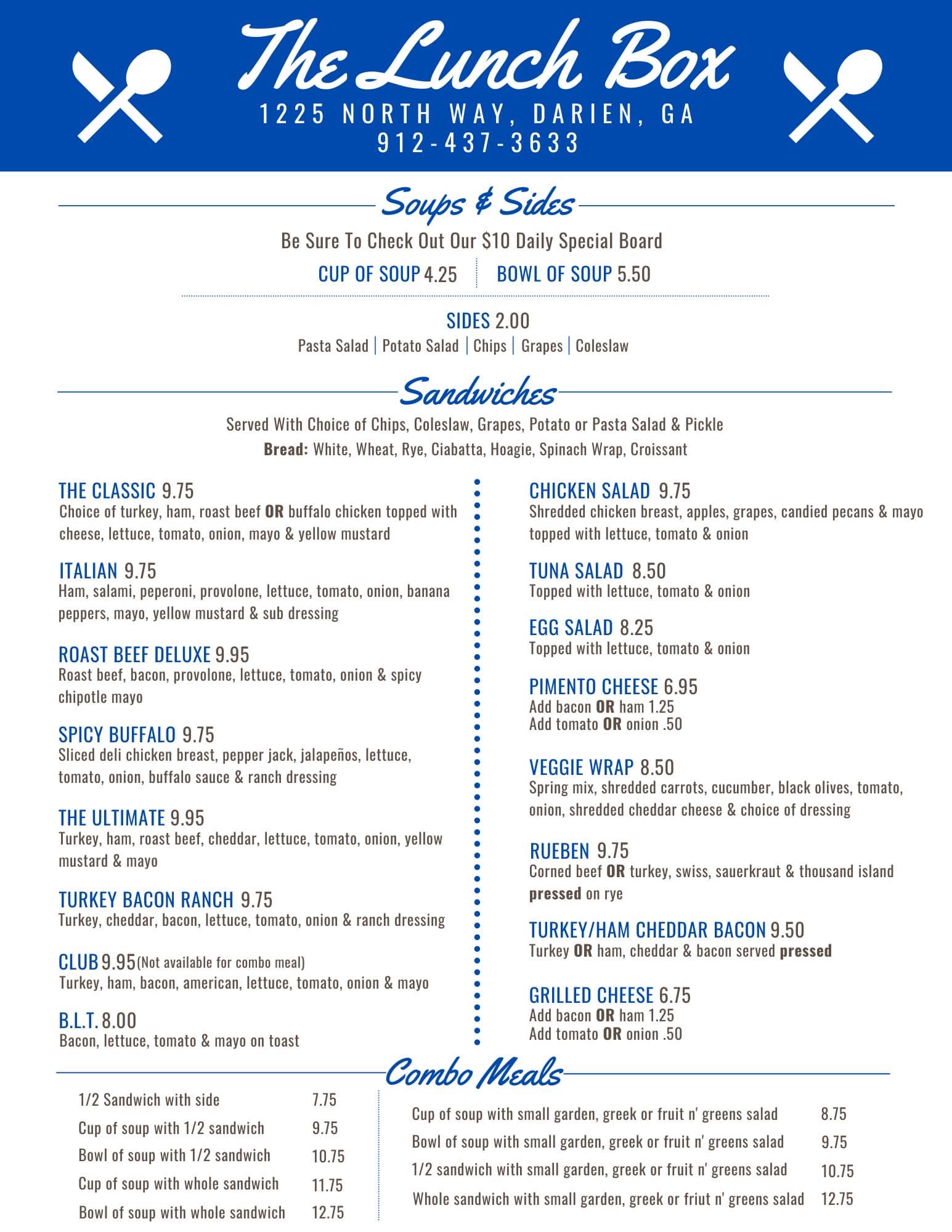 The Lunch Box specializes in homestyle lunch items. We are a family-owned small business and are proud to serve our neighbors in the Darien area.