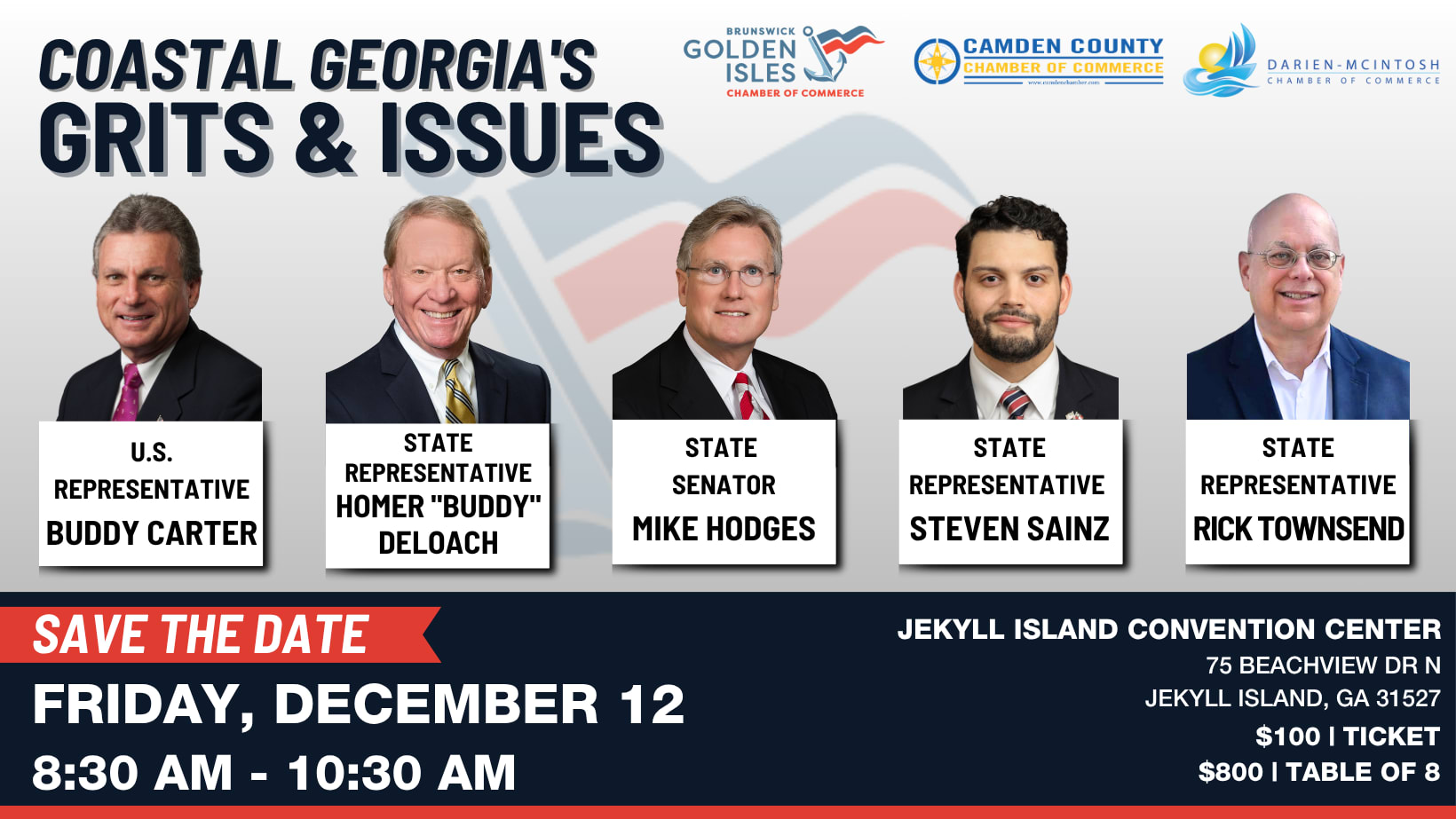 Please join us and our partners at Brunswick -Golden Isles Chamber and Camden County Chamber at the 2025 Coastal Georgia's Grits & Issues Breakfast as we bring together our local general assembly representatives and our congressman to discuss views on current legislative issues that affect the Coastal Georgia Region.