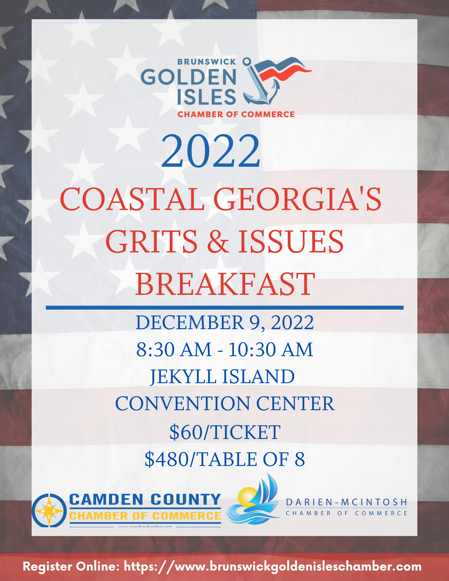 Please join us and our partners at Brunswick -Golden Isles Chamber and Camden County Chamber at the 2022 Coastal Georgia's Grits & Issues Breakfast as we bring together our local general assembly representatives and our congressman to discuss views on current legislative issues that affect the Coastal Georgia Region.