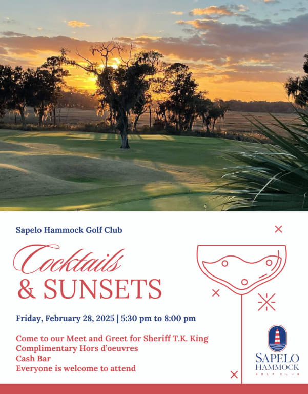 Come to this meet and greet with Sapelo Hammock Golf Club to connect with our Sheriff 'T.K' King! Complimentary Hour d'oeuvres and a cash bar. Everyone is welcome!Images