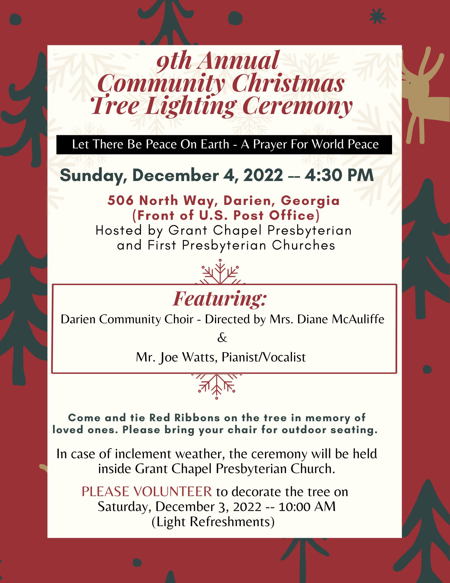 Discover Darien Community Christmas Tree Lighting with Caroling at the corner of Hwy 17 and Broad St immediately following the parade.