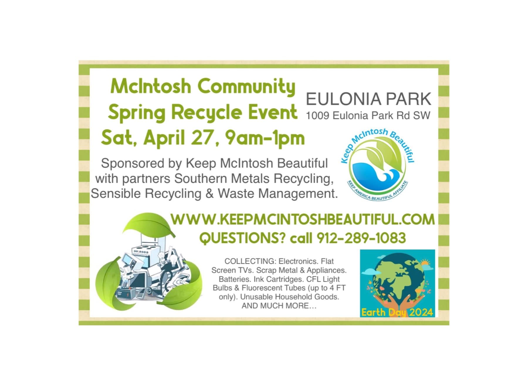 ALL SERVICES ARE FREE! IN CELEBRATION OF EARTH🌎 DAY 2024! Eulonia Park, 1009 Eulonia Park Rd SW. 9am-1pm COLLECTING: Electronics. Flat Screen TVs. Scrap Metal & Appliances. Batteries. Ink Cartridges. CFL Light Bulbs & Fluorescent Tubes (up to 4 FT only). Household Goods. AND MUCH MORE… Assistance will be available for unloading items and materials from vehicles. Each participant will also receive an updated McIntosh County Recycling Guide, listing where a wide variety of items and materials can be taken for reuse or recycling in our area. WWW.KEEPMCINTOSHBEAUTIFUL.COM QUESTIONS? call 912-289-1083 Sponsored by Keep McIntosh Beautiful with partners Southern Metals Recycling, Sensible Recycling & Waste Management.