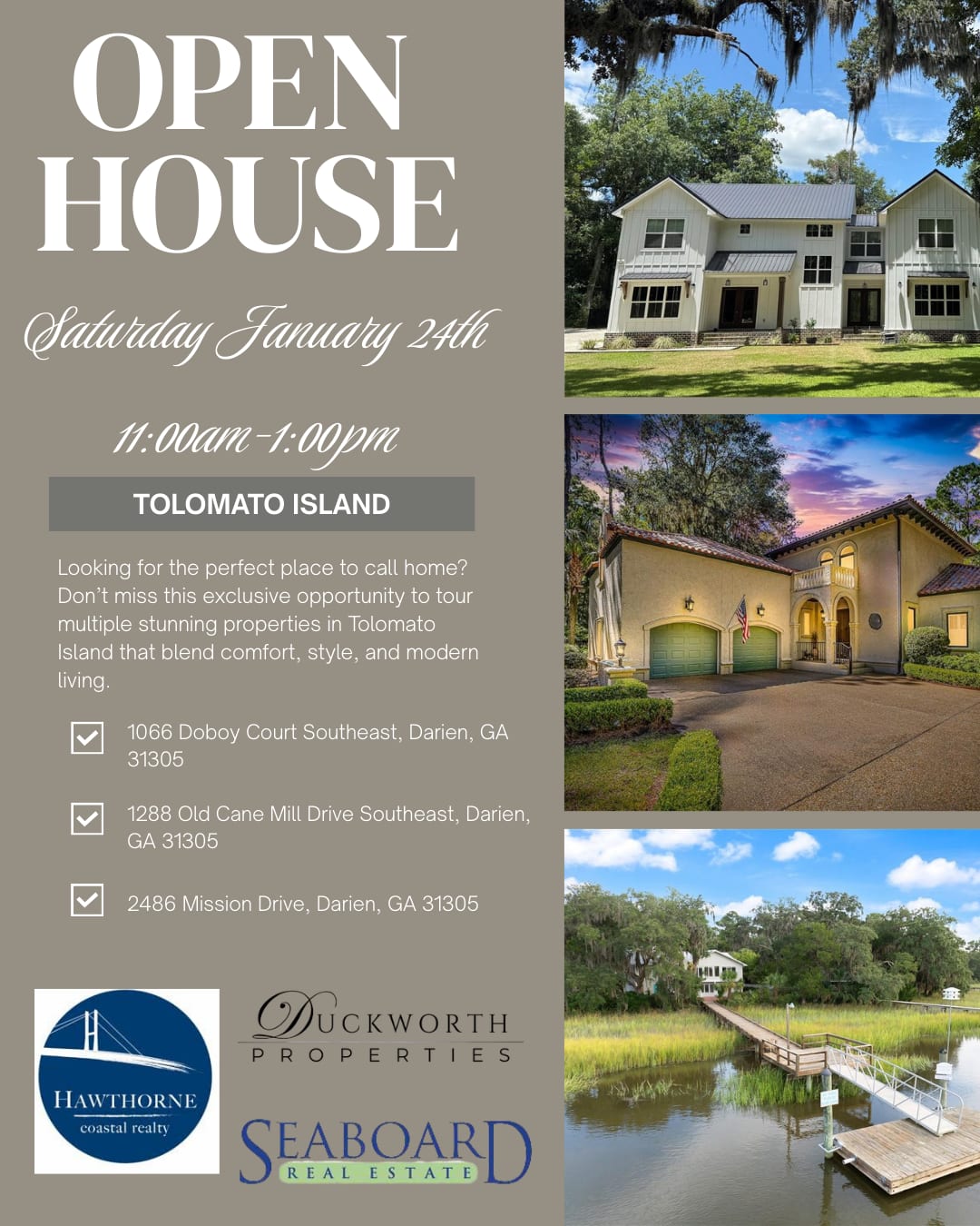 Join us for an Open House Tour on Tolomato Island this Saturday, January 24th, from 11:00 AM–1:00 PM. Explore multiple stunning properties that blend comfort, style, and modern coastal living—all in one afternoon. Featured Homes: • 1066 Doboy Court SE, Darien, GA 31305 • 1288 Old Cane Mill Drive SE, Darien, GA 31305 • 2486 Mission Drive, Darien, GA 31305 ✨ Bonus: Attend all three open houses and you’ll be entered to win a $100 Visa gift card! Don’t miss this exclusive opportunity to find your perfect place to call home.Images